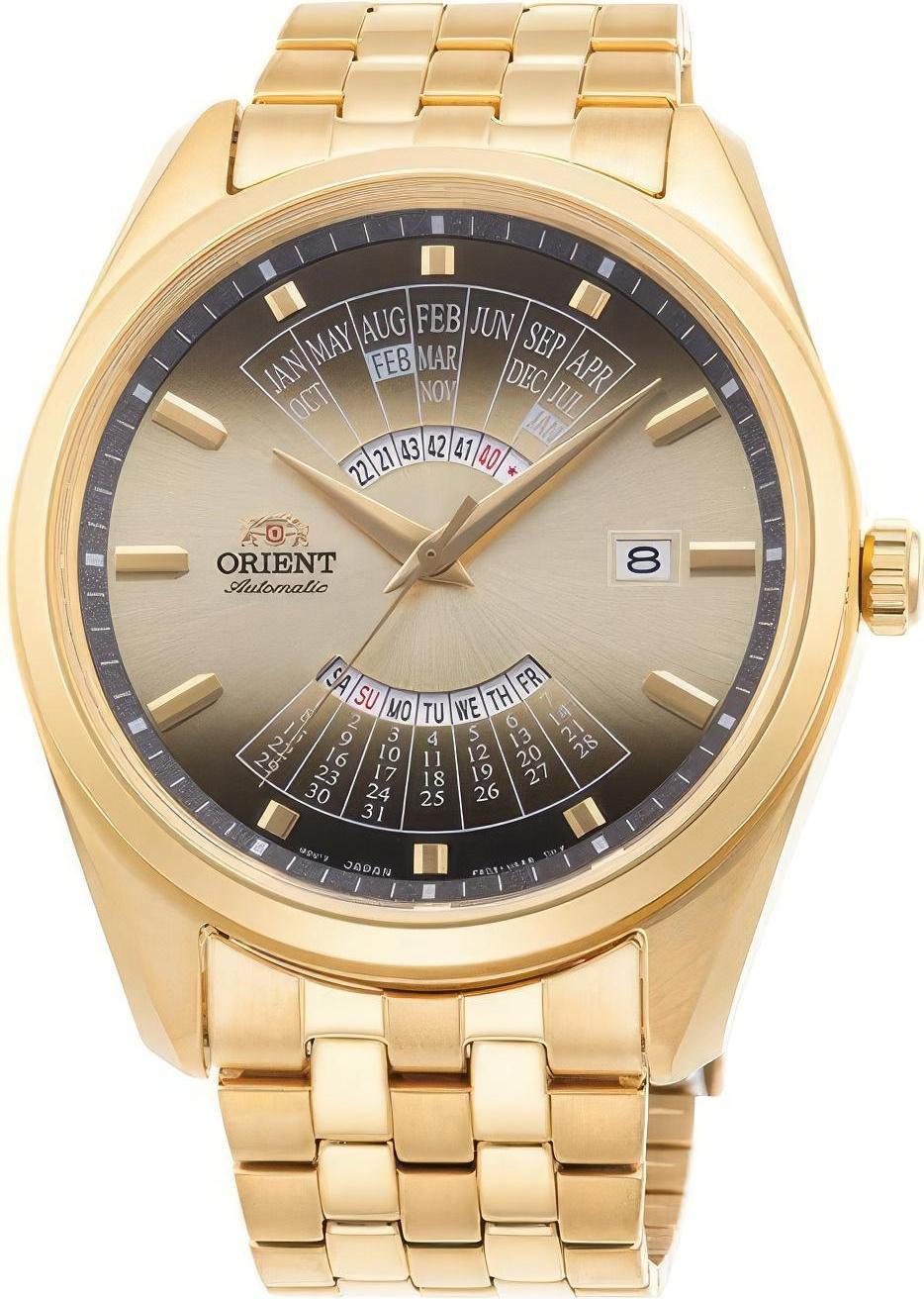 Мужские наручные часы Orient Multi Year Calendar RA-BA0001G. Механические с ручным подзаводом. Браслет из нержавеющей стали. Браслет из нержавеющей стали. Прочное, устойчивое к царапинам минеральное стекло защищает часы от повреждений. На циферблате отображается текущее число месяца и день недели. Часы являются водонепроницаемыми до 5 Бар. Цвет циферблата: Желтое золото. Цвет корпуса: Золотистый. Толщина: 12 мм. Гарантия: 2 года.