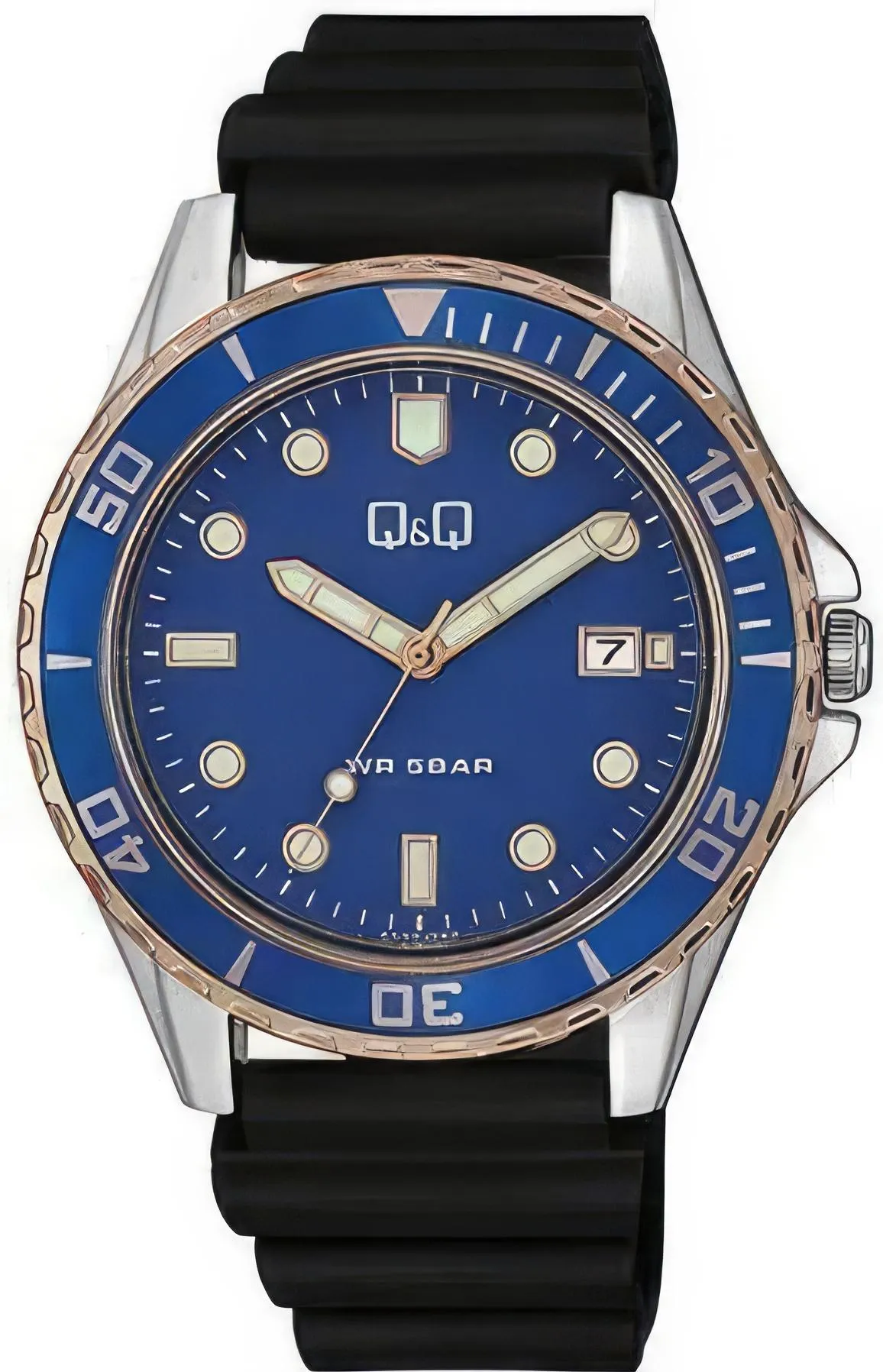 Мужские наручные часы Q&Q Attractive A172J382Y. Точный кварцевый механизм с аналоговой индикацией. Корпус изготовлен из высококачественной часовой латуни с высокими антикоррозийными свойствами. На стрелки и отметки нанесен светонакопительный состав, благодаря этому считывать информацию с циферблата возможно и в темноте. На циферблате отображается текущее число месяца. Ремешок изготовлен из каучука. Прочное, устойчивое к царапинам минеральное стекло защищает часы от повреждений.Часы являются водонепроницаемыми до 5 Бар. Цвет циферблата: Синий. Ширина (с заводной головкой): 43мм. Толщина: 11мм. Гарантия: 1 год.