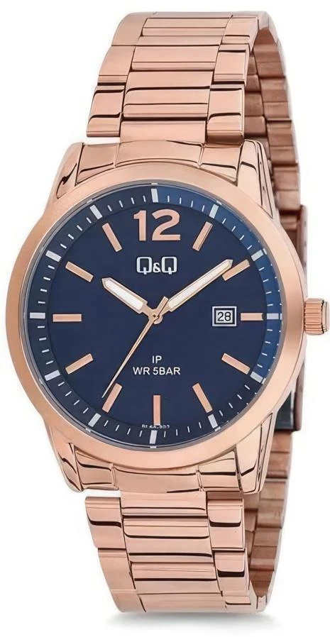 Мужские наручные часы Q&Q Attractive BL68J802Y. Корпус изготовлен из высококачественной часовой латуни с высокими антикоррозийными свойствами. На стрелки и отметки нанесен светонакопительный состав, благодаря этому считывать информацию с циферблата возможно и в темноте. На циферблате отображается текущее число месяца. Браслет из нержавеющей стали. Прочное, устойчивое к царапинам минеральное стекло защищает часы от повреждений.Часы являются водонепроницаемыми до 5 Бар. Цвет корпуса: Розовое золото. Цвет циферблата: Синий. Ширина (с заводной головкой): 42мм. Толщина: 10мм. Гарантия: 1 год.