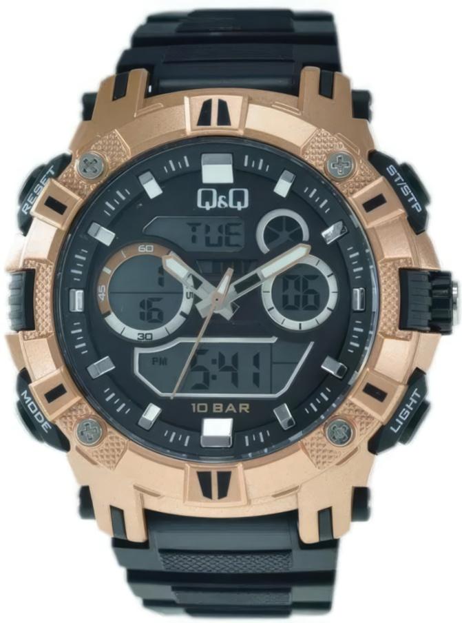 Мужские наручные часы Q&Q Attractive GW88J006Y. Точный кварцевый механизм с аналого-цифровой индикацией. Полимерный корпус надежно защищает часы от механических повреждений. Светодиодная подсветка. На циферблате отображается текущее число месяца и день недели. Функция хронографа. Полимерный ремешок. Натуральный полимерный материал является идеальным для изготовления ремешка благодаря своей чрезвычайной прочности и гибкости. Органическое стекло. Часы являются водонепроницаемыми до 10 Бар. Цвет корпуса: Желтое золото. Ширина (с заводной головкой): 55мм. Толщина: 16мм. Гарантия: 1 год.