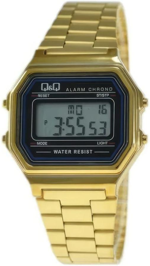 Мужские наручные часы Q&Q Attractive M173J003Y. Точный кварцевый механизм с цифровой индикацией. Корпус изготовлен из высококачественной часовой латуни с высокими антикоррозийными свойствами. Светодиодная подсветка. На циферблате отображается текущее число месяца и день недели. Браслет из нержавеющей стали. Органическое стекло. Часы являются водонепроницаемыми до 3 Бар. Цвет корпуса: Желтое золото. Цвет циферблата: Синий. Ширина (с заводной головкой): 38мм. Толщина: 10мм. Гарантия: 1 год.