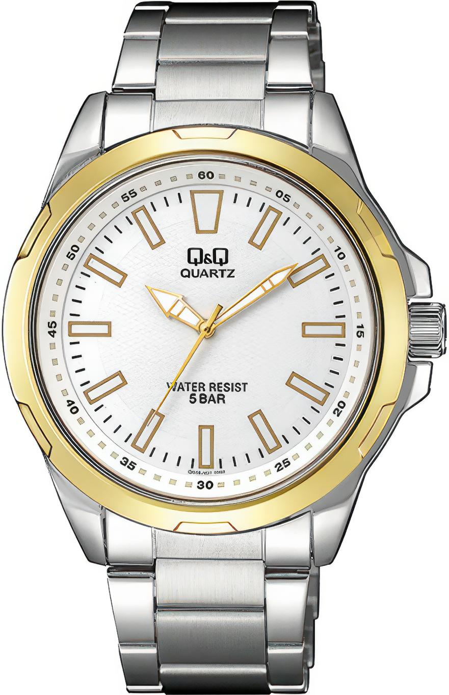 Мужские наручные часы Q&Q Attractive QA48J401Y. Точный кварцевый механизм с аналоговой индикацией. Корпус изготовлен из высококачественной часовой латуни с высокими антикоррозийными свойствами. На стрелки и отметки нанесен светонакопительный состав, благодаря этому считывать информацию с циферблата возможно и в темноте. Браслет из нержавеющей стали. Прочное, устойчивое к царапинам минеральное стекло защищает часы от повреждений.Часы являются водонепроницаемыми до 5 Бар. Цвет корпуса: Желтое золото. Цвет циферблата: Белый. Ширина (с заводной головкой): 44мм. Толщина: 11мм. Гарантия: 1 год.