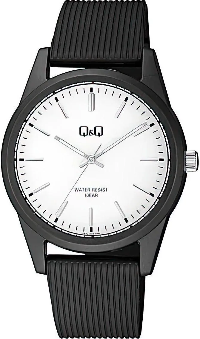 Мужские наручные часы Q&Q Attractive VS12J003Y. Точный кварцевый механизм с аналоговой индикацией. Полимерный корпус надежно защищает часы от механических повреждений. На стрелки и отметки нанесен светонакопительный состав, благодаря этому считывать информацию с циферблата возможно и в темноте. Полимерный ремешок. Натуральный полимерный материал является идеальным для изготовления ремешка благодаря своей чрезвычайной прочности и гибкости. Органическое стекло. Часы являются водонепроницаемыми до 10 Бар. Цвет корпуса: Черный. Цвет циферблата: Белый. Ширина (с заводной головкой): 40мм. Толщина: 10мм. Гарантия: 1 год.