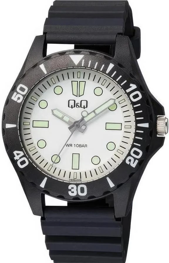 Мужские наручные часы Q&Q Attractive VS26J006Y. Точный кварцевый механизм с аналоговой индикацией. Полимерный корпус надежно защищает часы от механических повреждений. На стрелки и отметки нанесен светонакопительный состав, благодаря этому считывать информацию с циферблата возможно и в темноте. Полимерный ремешок. Натуральный полимерный материал является идеальным для изготовления ремешка благодаря своей чрезвычайной прочности и гибкости. Органическое стекло. Часы являются водонепроницаемыми до 10 Бар. Цвет корпуса: Черный. Цвет циферблата: Белый. Ширина (с заводной головкой): 42мм. Толщина: 13мм. Гарантия: 1 год.