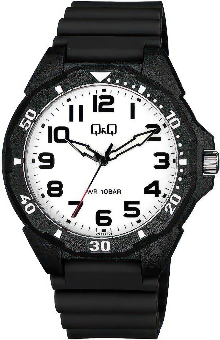 Мужские наручные часы Q&Q Attractive VS44J001Y. Точный кварцевый механизм. Полимерный корпус надежно защищает часы от механических повреждений. На стрелки и отметки нанесен светонакопительный состав, благодаря этому считывать информацию с циферблата возможно и в темноте. Полимерный ремешок. Натуральный полимерный материал является идеальным для изготовления ремешка благодаря своей чрезвычайной прочности и гибкости. Прочное, устойчивое к царапинам минеральное стекло защищает часы от повреждений.Часы являются водонепроницаемыми до 10 Бар. Цвет корпуса: Черный. Ширина (с заводной головкой): 43мм. Толщина: 12мм. Гарантия: 1 год.
