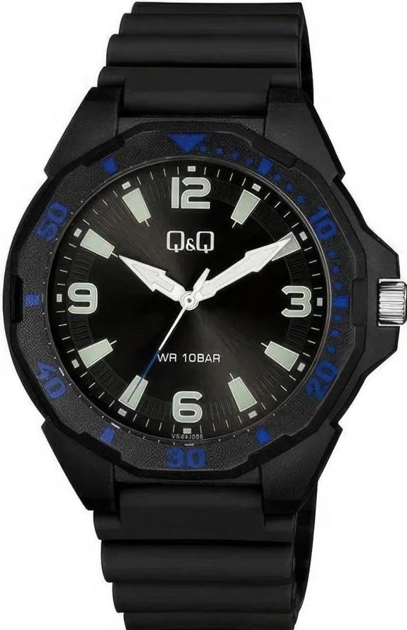 Мужские наручные часы Q&Q Attractive VS44J008Y. Точный кварцевый механизм с аналоговой индикацией. Полимерный корпус надежно защищает часы от механических повреждений. На стрелки и отметки нанесен светонакопительный состав, благодаря этому считывать информацию с циферблата возможно и в темноте. Полимерный ремешок. Натуральный полимерный материал является идеальным для изготовления ремешка благодаря своей чрезвычайной прочности и гибкости. Органическое стекло. Часы являются водонепроницаемыми до 10 Бар. Цвет корпуса: Черный. Цвет циферблата: Черный. Ширина (с заводной головкой): 43мм. Толщина: 12мм. Гарантия: 1 год.