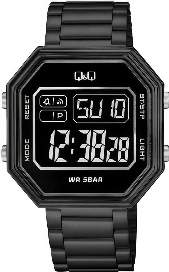 Мужские наручные часы Q&Q Attractive Women M206J008Y. Точный кварцевый механизм с цифровой индикацией. Полимерный корпус надежно защищает часы от механических повреждений. Светодиодная подсветка. На циферблате отображается текущее число, месяц и день недели. Функция хронографа. Функция будильника. Функция хронографа. Функция будильника. Браслет из нержавеющей стали. Органическое стекло. Часы являются водонепроницаемыми до 5 Бар. Цвет корпуса: Черный. Цвет циферблата: Черный. Ширина (с заводной головкой): 42мм. Толщина: 12мм. Гарантия: 1 год.