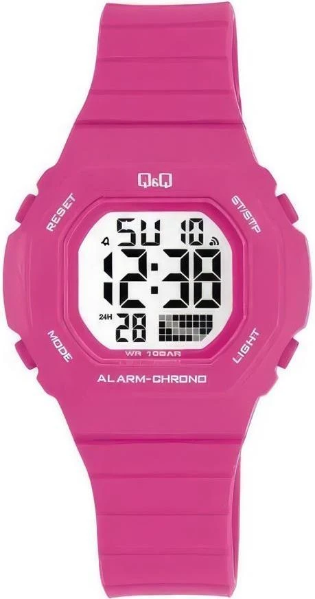 Электронные часы с точность хода не хуже -10 +15 сек./в месяц. • Ежедневный будильник со звуковым сигналом. • Секундомер. • Таймер обратного отсчета. • Автоматический календарь. • Электрическая подсветка - для освещения циферблата используется светодиод. • Минеральное стекло устойчивое к возникновению царапин. • Надёжный корпус из прочного и лёгкого пластика. • Розовый каучуковый ремешок. • Водозащита до 10 АТМ. • Диаметр корпуса 38 мм, толщина 11 мм. Вес 47 гр.