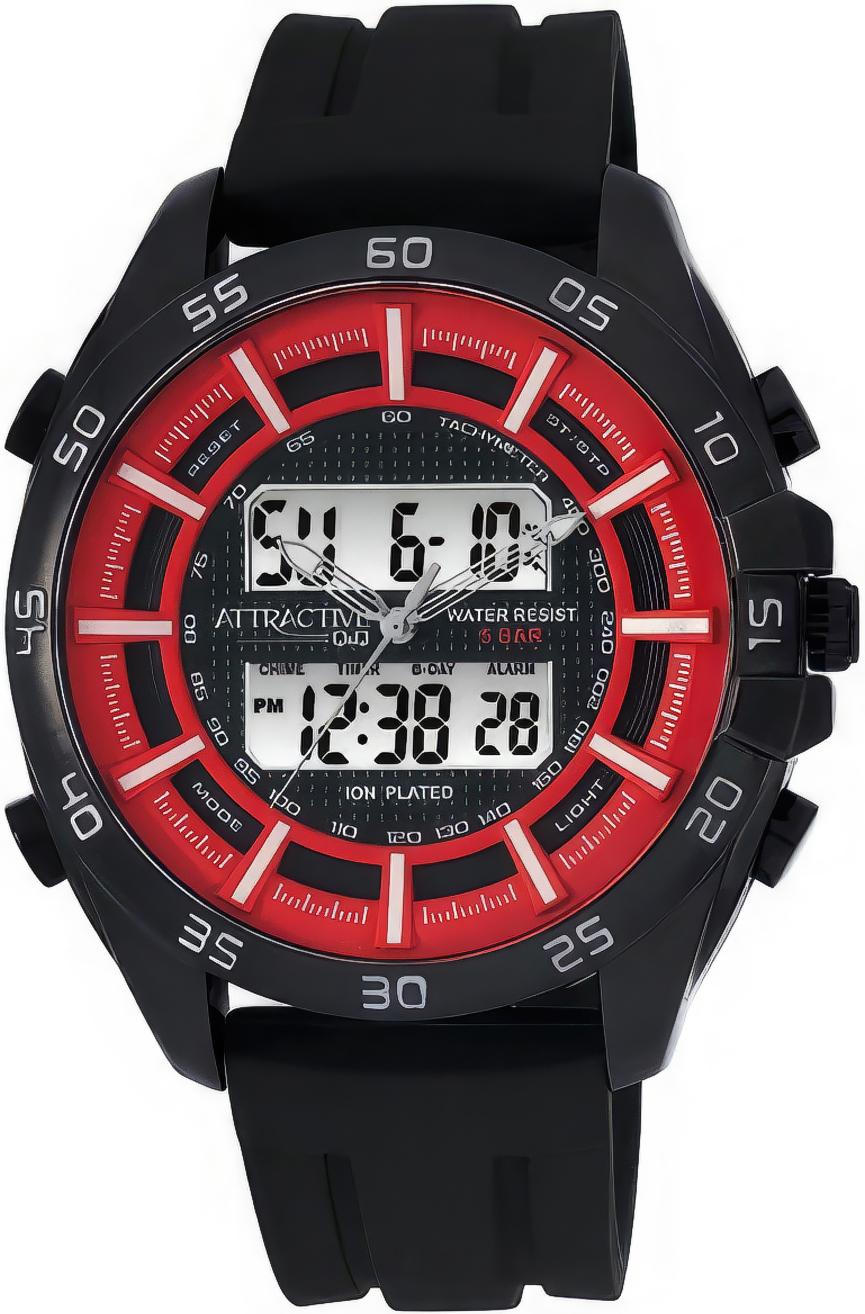 Мужские наручные часы Q&Q  DE08J542Y. Точный кварцевый механизм с аналого-цифровой индикацией. Корпус изготовлен из высококачественной часовой латуни с высокими антикоррозийными свойствами. Светодиодная подсветка. На циферблате отображается текущее число, месяц и день недели. Полимерный ремешок. Натуральный полимерный материал является идеальным для изготовления ремешка благодаря своей чрезвычайной прочности и гибкости. Прочное, устойчивое к царапинам минеральное стекло защищает часы от повреждений.Часы являются водонепроницаемыми до 5 Бар. Цвет корпуса: Черный. Ширина (с заводной головкой): 50мм. Гарантия: 1 год.
