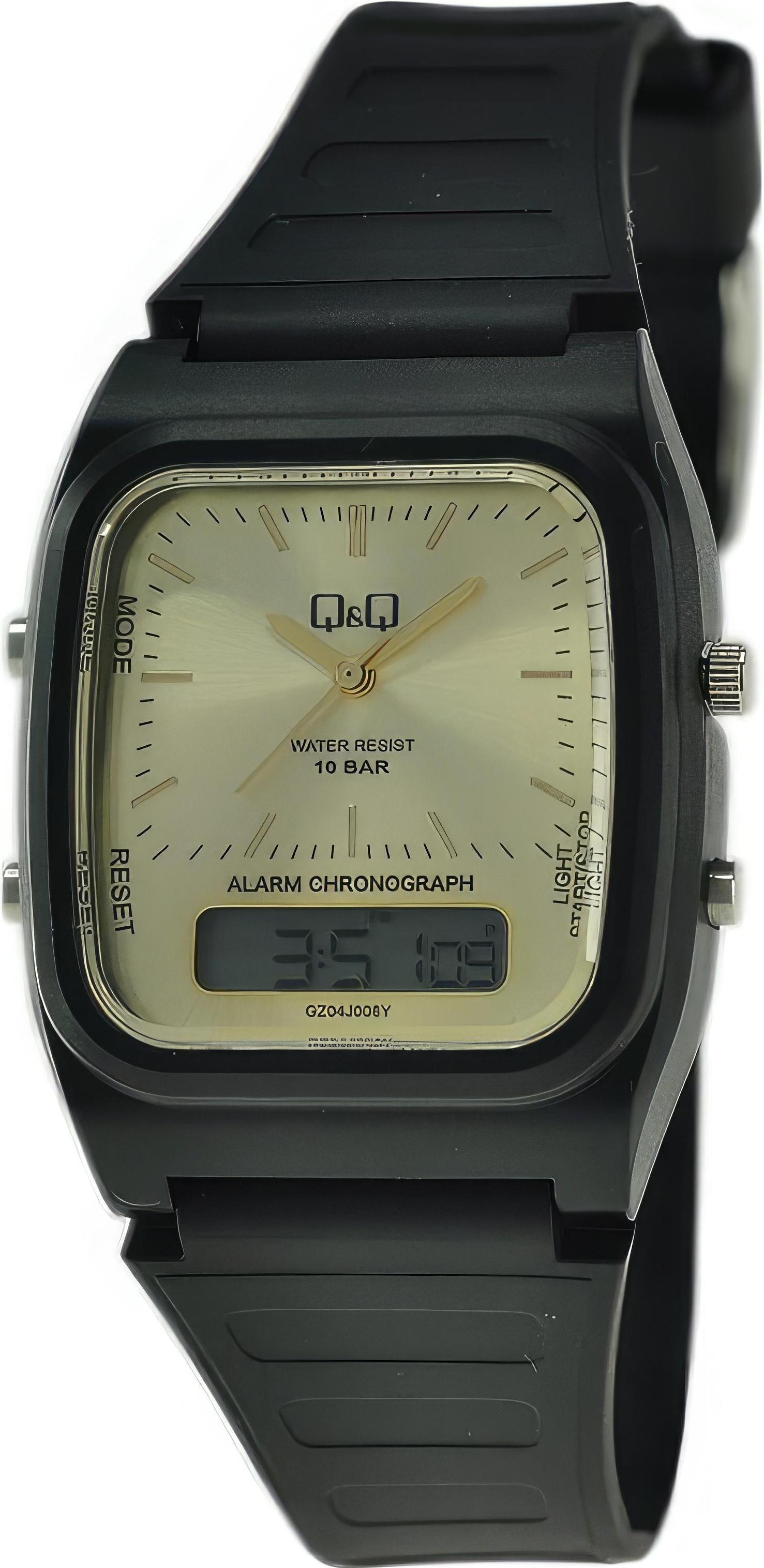 Мужские наручные часы Q&Q  GZ04J008Y. Точный кварцевый механизм с аналого-цифровой индикацией. Полимерный корпус надежно защищает часы от механических повреждений. Светодиодная подсветка. На циферблате отображается текущее число, месяц и день недели. Полимерный ремешок. Натуральный полимерный материал является идеальным для изготовления ремешка благодаря своей чрезвычайной прочности и гибкости. Прочное, устойчивое к царапинам минеральное стекло защищает часы от повреждений.Часы являются водонепроницаемыми до 10 Бар. Цвет корпуса: Черный. Цвет циферблата: Коричневый. Ширина (с заводной головкой): 54мм. Гарантия: 1 год.