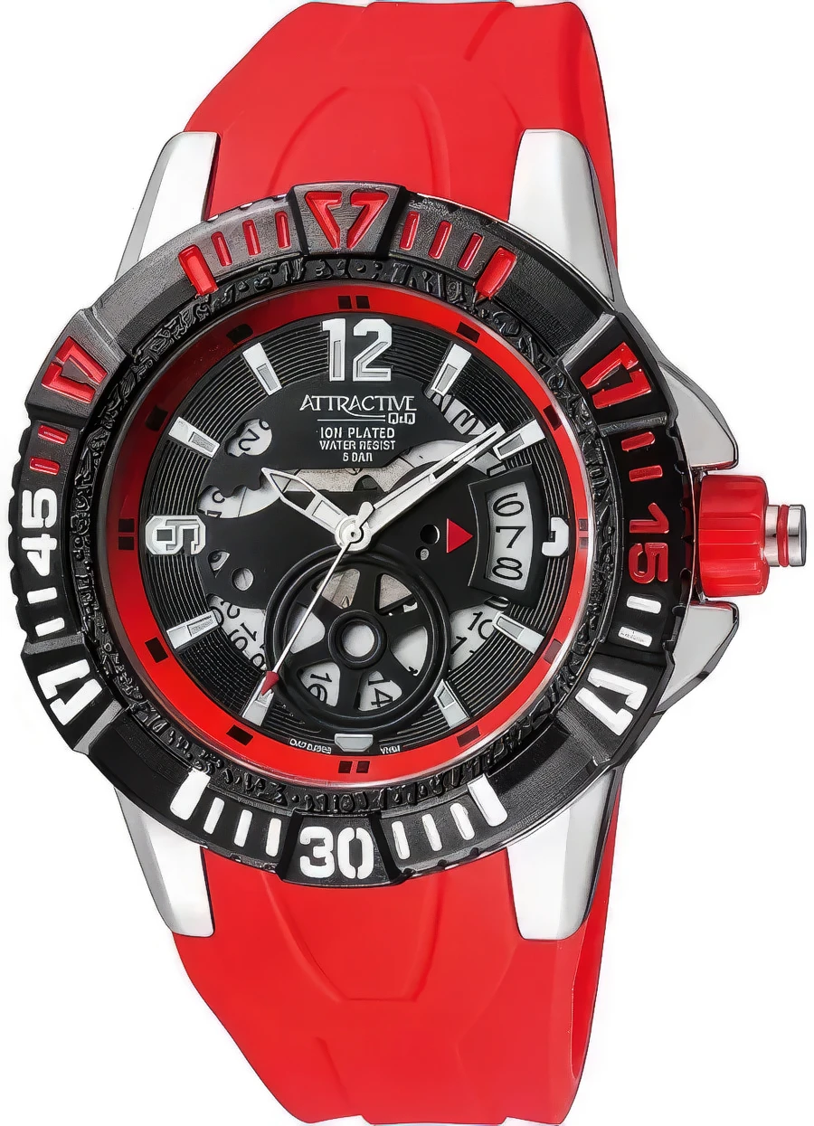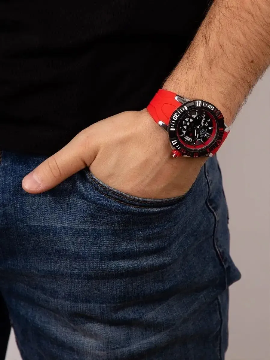 Точный кварцевый механизм. Центральная секундная стрелка. Окошко даты. • Точность хода не хуже -10 +15 сек./в месяц. • Светонакопительный состав на стрелках. • Минеральное стекло устойчивое к возникновению царапин. • Корпус из высококачественного стального сплава и пластика. • Красный каучуковый ремешок. • Водозащита до 5 АТМ. • Диаметр корпуса 45 мм, толщина 12 мм. Вес 55 гр.