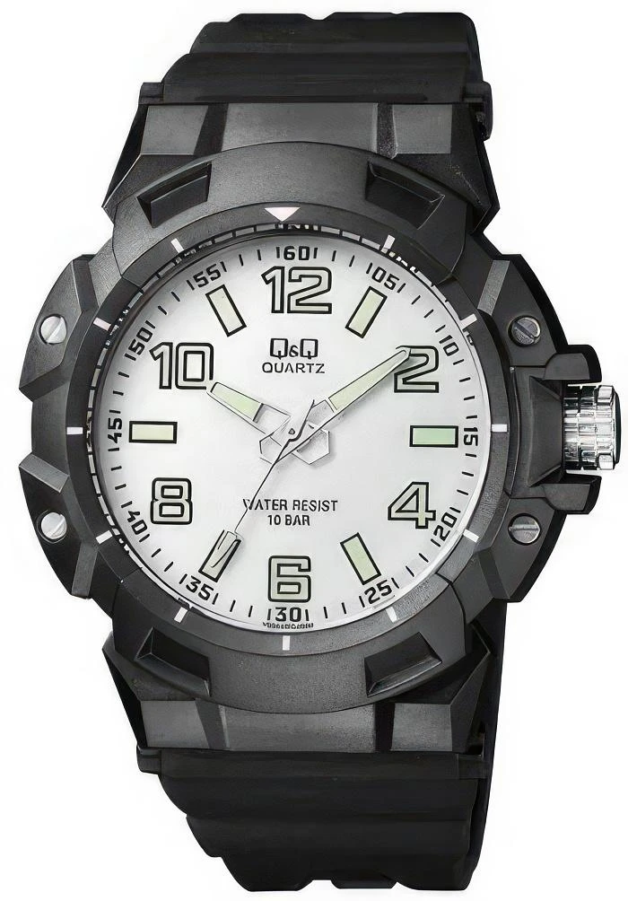 Мужские наручные часы Q&Q VR84J001Y. Точный кварцевый механизм с аналоговой индикацией. Полимерный корпус надежно защищает часы от механических повреждений. Полимерный ремешок. Натуральный полимерный материал является идеальным для изготовления ремешка благодаря своей чрезвычайной прочности и гибкости. Прочное, устойчивое к царапинам минеральное стекло защищает часы от повреждений.Часы являются водонепроницаемыми до 10 Бар. Цвет корпуса: Черный. Цвет циферблата: Белый. Ширина (с заводной головкой): 50мм. Гарантия: 1 год.