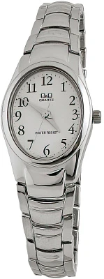 Женские наручные часики небольшого диаметра на прочном стальном браслете в корпусе овальной формы.
