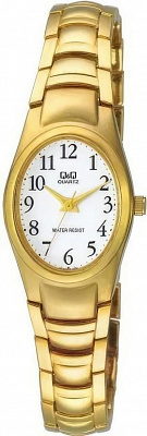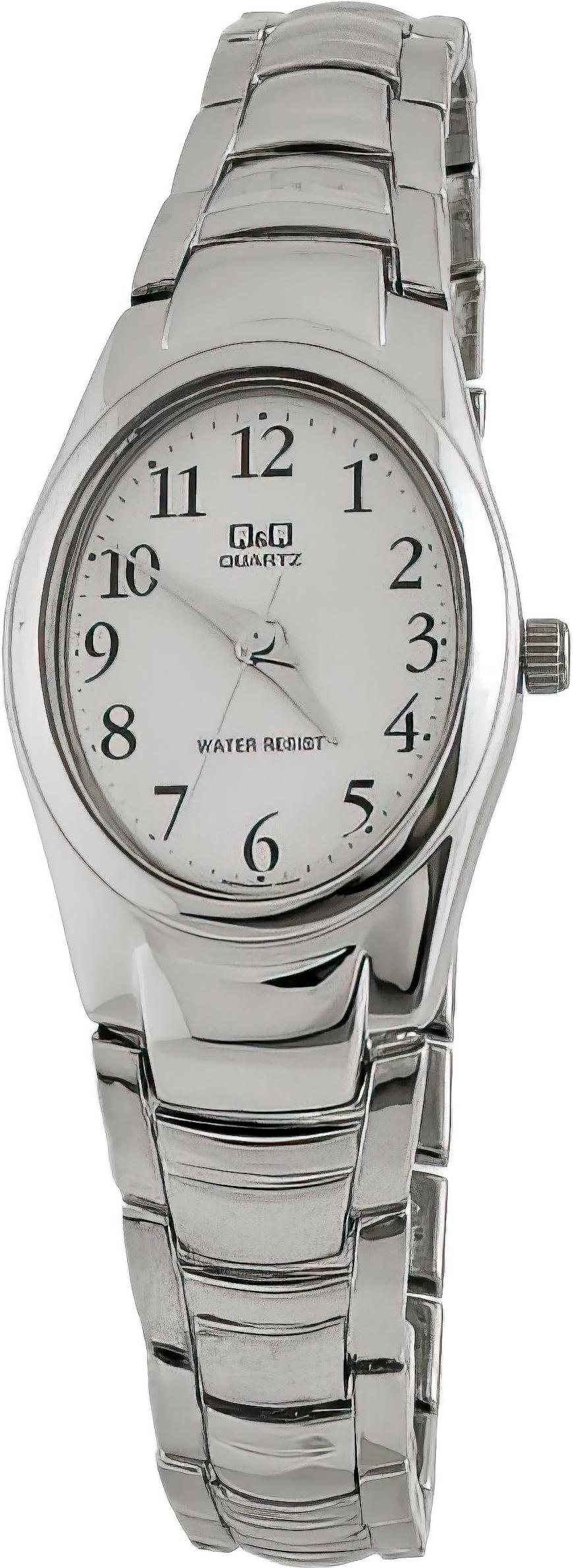 Женские наручные часики небольшого диаметра на прочном стальном браслете в корпусе овальной формы.