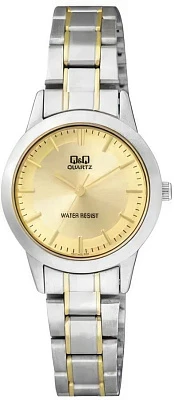 <b>Женские наручные часы Q&Q  Q947J400Y.</b> Точный кварцевый механизм с аналоговой индикацией. Корпус изготовлен из высококачественной часовой латуни с высокими антикоррозийными свойствами. Браслет из нержавеющей стали. Прочное, устойчивое к царапинам минеральное стекло защищает часы от повреждений.Часы являются водонепроницаемыми до 3 Бар. Цвет корпуса: Серебристый. Цвет циферблата: Золотистый. Ширина (с заводной головкой): 30мм. Гарантия: 1 год.
