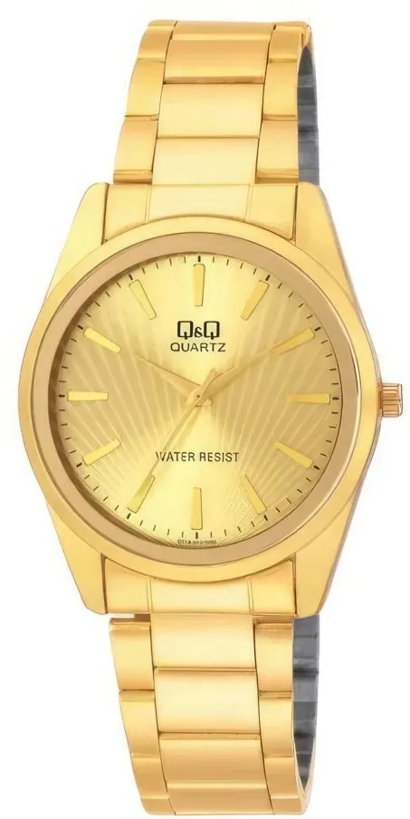 <b>Мужские наручные часы Q&Q Q718J010Y.</b> Точный кварцевый механизм с аналоговой индикацией. Корпус изготовлен из высококачественной часовой латуни с высокими антикоррозийными свойствами. Браслет из нержавеющей стали. Прочное, устойчивое к царапинам минеральное стекло защищает часы от повреждений.Часы являются водонепроницаемыми до 3 Бар. Цвет корпуса: Желтое золото. Цвет циферблата: Золотистый. Гарантия: 1 год.