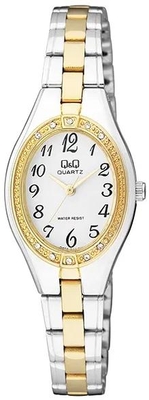 Женские наручные часы на прочном стальном браслете в овальном корпусе, украшенном стразами.