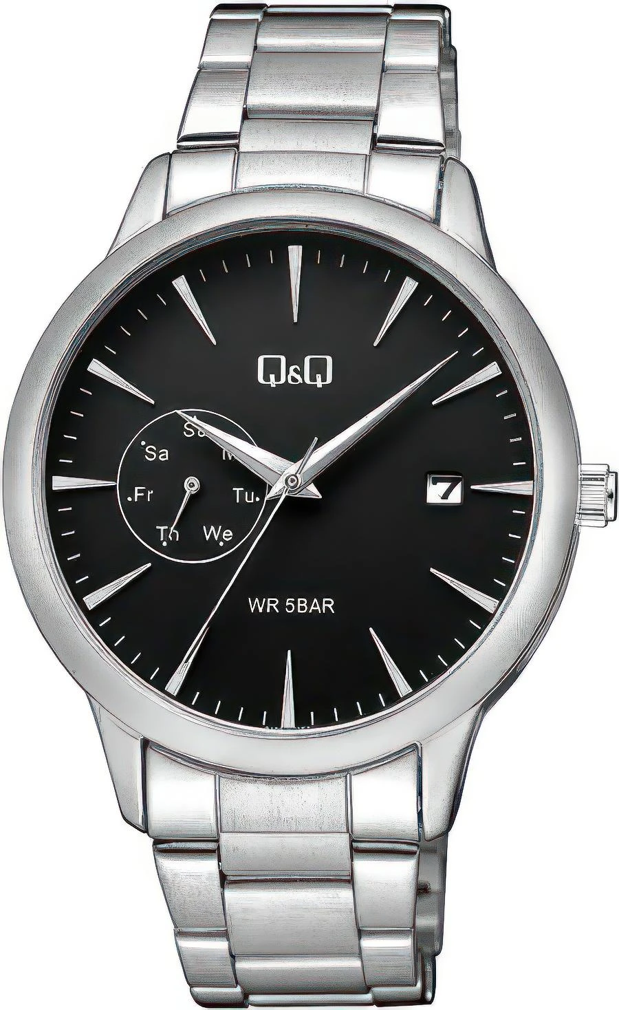 Мужские наручные часы Q&Q Casual A12AJ009Y. Точный кварцевый механизм с аналоговой индикацией. Браслет из нержавеющей стали. Латунный браслет. Прочное, устойчивое к царапинам минеральное стекло защищает часы от повреждений. На циферблате отображается текущее число месяца и день недели. Часы являются водонепроницаемыми до 5 Бар. Цвет циферблата: Серебристый. Цвет корпуса: Черный. Толщина: 9 мм. Гарантия: 1 год.