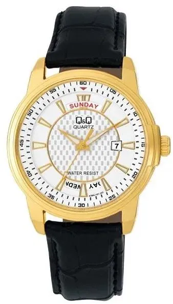 Мужские наручные часы Q&Q A184J101Y. Точный кварцевый механизм с аналоговой индикацией. Корпус изготовлен из высококачественной нержавеющей стали 316L с высокими антикоррозийными свойствами. На стрелки и отметки нанесен светонакопительный состав, благодаря этому считывать информацию с циферблата возможно и в темноте. На циферблате отображается текущее число месяца и день недели. Ремешок изготовлен из кожи. Прочное, устойчивое к царапинам минеральное стекло защищает часы от повреждений. Часы являются водонепроницаемыми до 3 Бар. Цвет корпуса: Желтое золото. Цвет циферблата: Белый. Ширина (с заводной головкой): 40мм. Толщина: 10мм. Гарантия: 1 год.