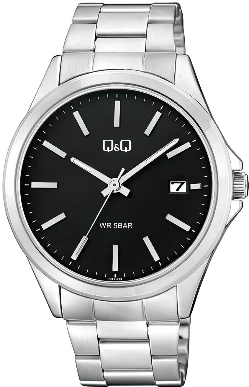 <b>Мужские наручные часы Q&Q Casual A484J202Y.</b> Точный кварцевый механизм с аналоговой индикацией. Корпус изготовлен из высококачественной часовой латуни с высокими антикоррозийными свойствами. На стрелки и отметки нанесен светонакопительный состав, благодаря этому считывать информацию с циферблата возможно и в темноте. На циферблате отображается текущее число месяца. Браслет из нержавеющей стали. Прочное, устойчивое к царапинам минеральное стекло защищает часы от повреждений.Часы являются водонепроницаемыми до 5 Бар. Цвет корпуса: Серебристый. Цвет циферблата: Черный. Ширина (с заводной головкой): 43мм. Толщина: 10мм. Гарантия: 1 год.
