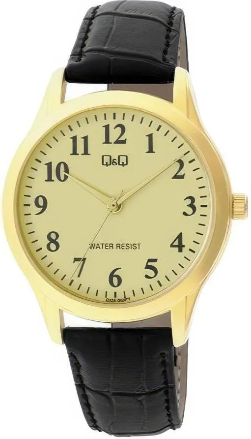 Женские наручные часы Q&Q Casual C02AJ009Y. Точный кварцевый механизм с аналоговой индикацией. Ремешок изготовлен из кожи. Браслет из нержавеющей стали. Прочное, устойчивое к царапинам минеральное стекло защищает часы от повреждений. Часы являются водонепроницаемыми до 3 Бар. Цвет циферблата: Желтое золото. Цвет корпуса: Золотистый. Толщина: 8 мм. Гарантия: 1 год.