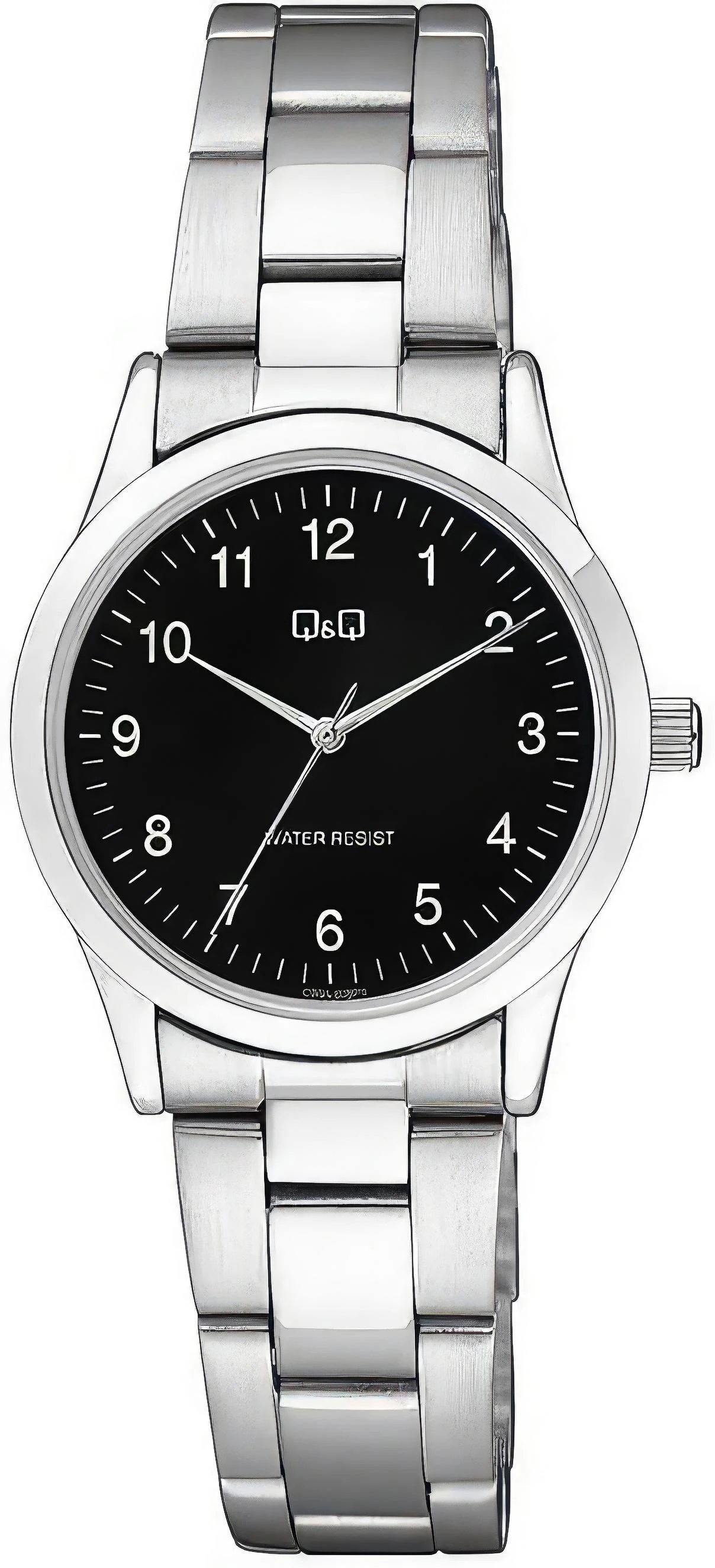 Женские наручные часы Q&Q Casual C09AJ005Y. Точный кварцевый механизм с аналоговой индикацией. Браслет из нержавеющей стали. Латунный браслет. Прочное, устойчивое к царапинам минеральное стекло защищает часы от повреждений. Часы являются водонепроницаемыми до 3 Бар. Цвет циферблата: Серебристый. Цвет корпуса: Черный. Толщина: 8 мм. Гарантия: 1 год.