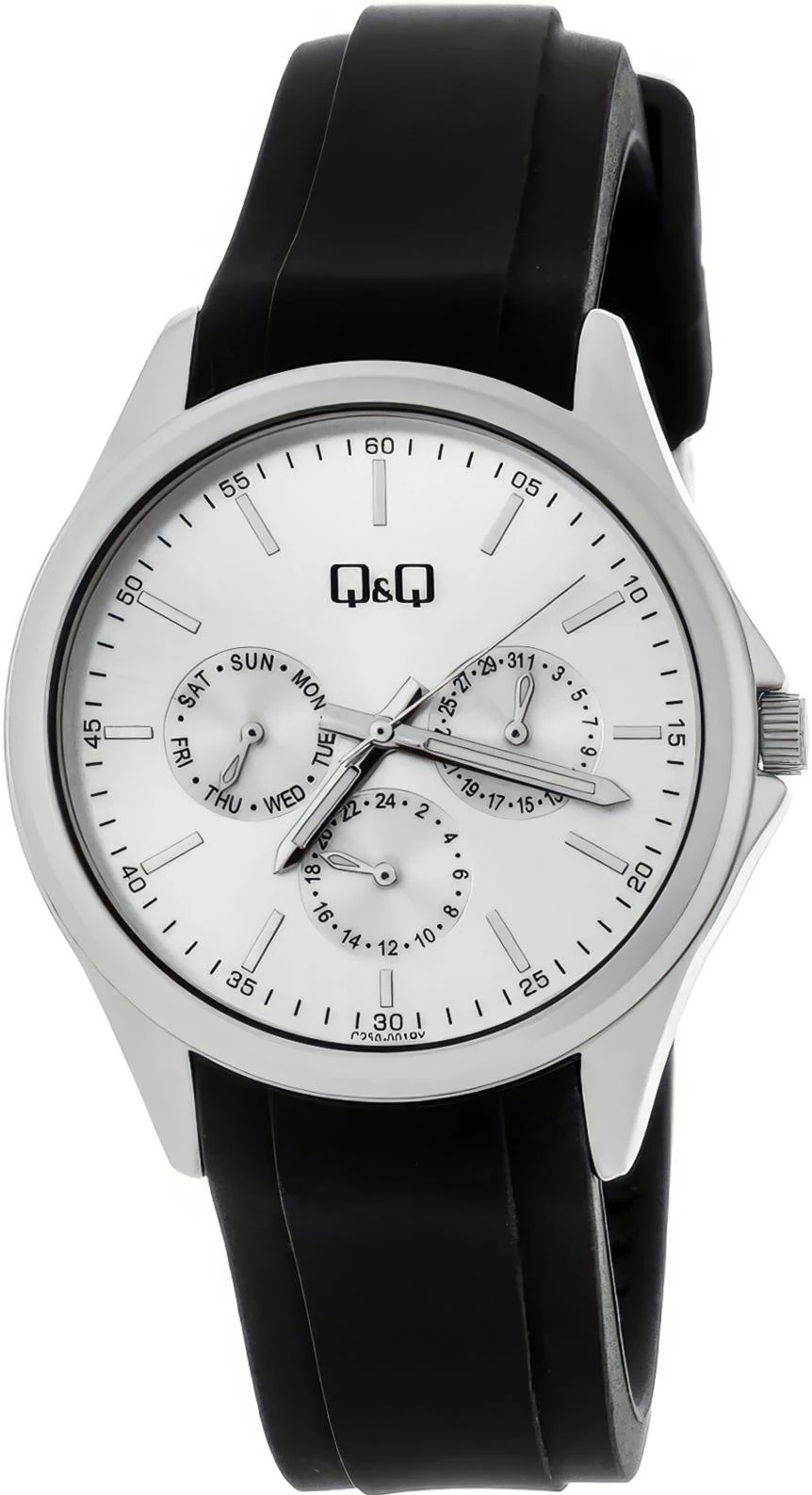 Женские наручные часы Q&Q Casual C25AJ001Y. Точный кварцевый механизм с аналоговой индикацией. Полимерный ремешок. Натуральный полимерный материал является идеальным для изготовления ремешка благодаря своей чрезвычайной прочности и гибкости. Отображение времени возможно в 12-часовом или 24-часовом формате. Браслет из нержавеющей стали. Прочное, устойчивое к царапинам минеральное стекло защищает часы от повреждений. На циферблате отображается текущее число месяца и день недели. Часы являются водонепроницаемыми до 5 Бар. Цвет циферблата: Серебристый. Цвет корпуса: Серебристый. На стрелки и отметки нанесен светонакопительный состав, благодаря этому считывать информацию с циферблата возможно и в темноте. Толщина: 9 мм. Гарантия: 1 год.
