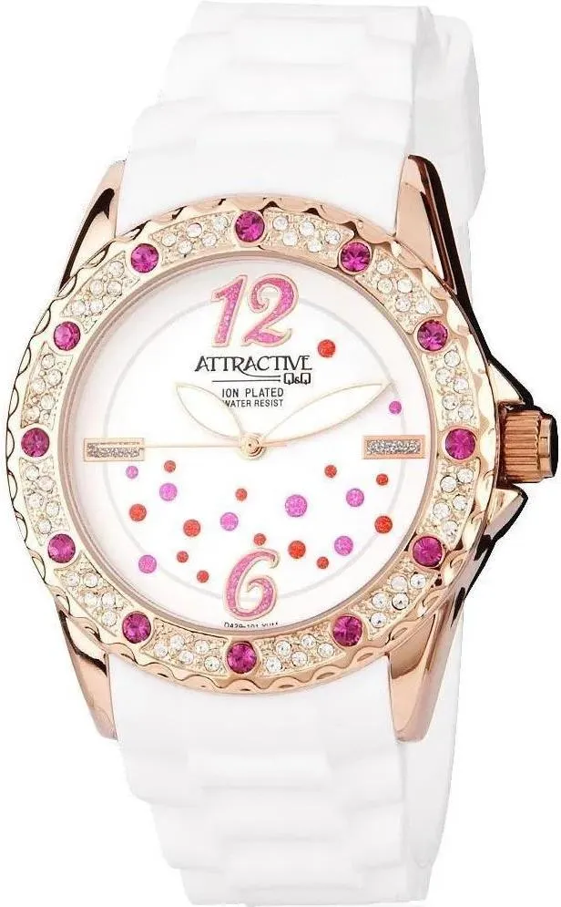 Женские наручные часы Q&Q DA29J101Y. Точный кварцевый механизм с аналоговой индикацией. Корпус изготовлен из высококачественной часовой латуни с высокими антикоррозийными свойствами. На стрелки и отметки нанесен светонакопительный состав, благодаря этому считывать информацию с циферблата возможно и в темноте. Ремешок изготовлен из каучука. Прочное, устойчивое к царапинам минеральное стекло защищает часы от повреждений.Часы являются водонепроницаемыми до 3 Бар. Цвет корпуса: Белый. Цвет циферблата: Белый. Ширина (с заводной головкой): 38мм. Толщина: 9мм. Гарантия: 1 год.
