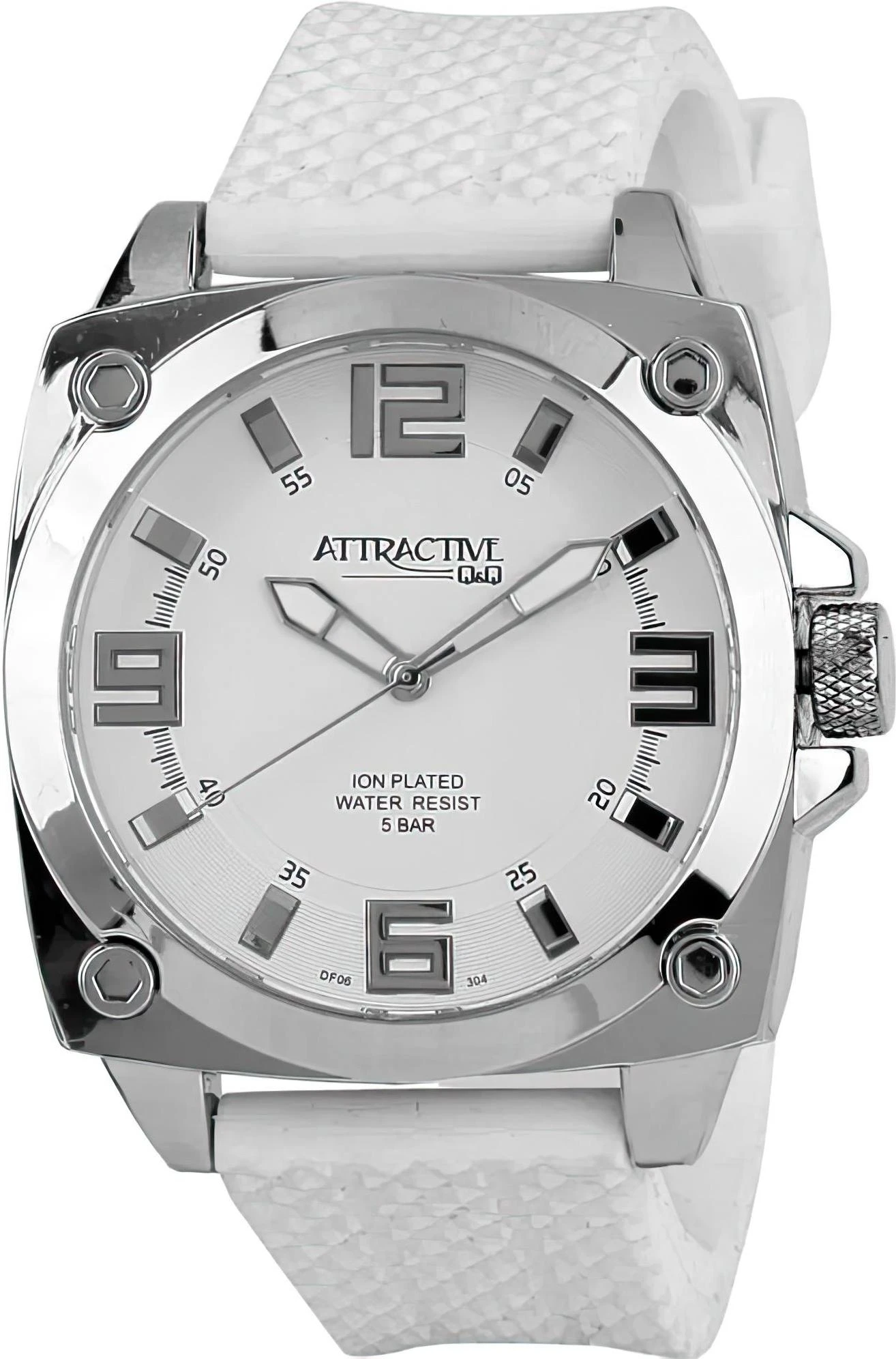 Мужские наручные часы Q&Q DF06J304Y. Точный кварцевый механизм с аналоговой индикацией. Корпус изготовлен из высококачественной нержавеющей стали 316L с высокими антикоррозийными свойствами. На стрелки и отметки нанесен светонакопительный состав, благодаря этому считывать информацию с циферблата возможно и в темноте. Ремешок изготовлен из каучука. Прочное, устойчивое к царапинам минеральное стекло защищает часы от повреждений. Часы являются водонепроницаемыми до 5 Бар. Цвет корпуса: Серебристый. Цвет циферблата: Белый. Ширина (с заводной головкой): 44мм. Толщина: 11мм. Гарантия: 1 год.