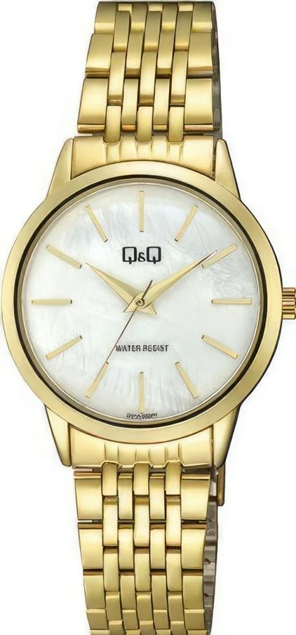 Женские наручные часы Q&Q Casual Q01AJ002Y. Точный кварцевый механизм с аналоговой индикацией. Браслет из нержавеющей стали. Латунный браслет. Прочное, устойчивое к царапинам минеральное стекло защищает часы от повреждений. Часы являются водонепроницаемыми до 3 Бар. Цвет циферблата: Желтое золото. Цвет корпуса: Белый. Цвет корпуса: Перламутровый. Толщина: 8 мм. Гарантия: 1 год.