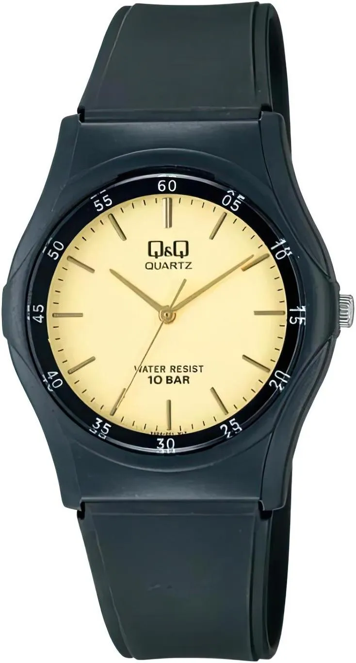 Мужские наручные часы Q&Q VQ04J001Y. Точный кварцевый механизм с аналоговой индикацией. Полимерный корпус надежно защищает часы от механических повреждений. Полимерный ремешок. Натуральный полимерный материал является идеальным для изготовления ремешка благодаря своей чрезвычайной прочности и гибкости. Органическое стекло. Часы являются водонепроницаемыми до 10 Бар. Цвет корпуса: Черный. Цвет циферблата: Золотистый. Гарантия: 1 год.