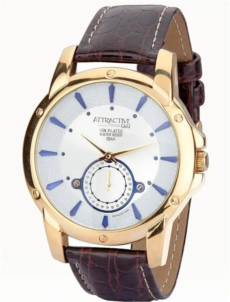 Мужские наручные часы Q&Q DA14J101Y. Точный кварцевый механизм с аналоговой индикацией. Корпус изготовлен из высококачественной нержавеющей стали 316L с высокими антикоррозийными свойствами. Ремешок изготовлен из кожи. Прочное, устойчивое к царапинам минеральное стекло защищает часы от повреждений. Часы являются водонепроницаемыми до 5 Бар. Цвет корпуса: Желтое золото. Цвет циферблата: Голубой. Ширина (с заводной головкой): 44мм. Толщина: 11мм. Гарантия: 1 год.