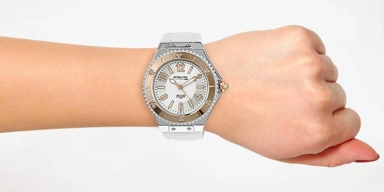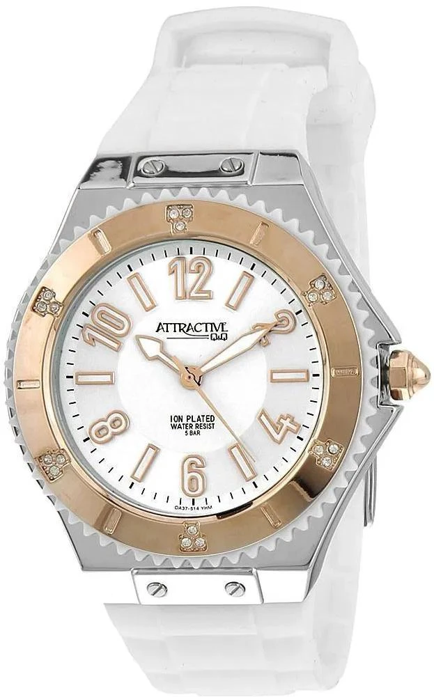 Точный кварцевый механизм. Центральная секундная стрелка. • Точность хода не хуже -10 +15 сек./в месяц. • Светонакопительный состав на стрелках. • Минеральное стекло устойчивое к возникновению царапин. • Корпус из латуни со стойким PVD покрытием. • Инкрустация искусственными кристаллами. • Белый каучуковый ремешок. • Водозащита до 5 АТМ. • Диаметр корпуса 43 мм, толщина 12 мм. Вес 45 гр.