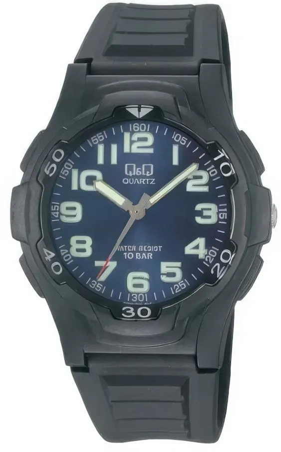 <b>Мужские наручные часы Q&Q VP84J003Y.</b> Точный кварцевый механизм с аналоговой индикацией. Полимерный корпус надежно защищает часы от механических повреждений. Полимерный ремешок. Натуральный полимерный материал является идеальным для изготовления ремешка благодаря своей чрезвычайной прочности и гибкости. Органическое стекло. Часы являются водонепроницаемыми до 10 Бар. Цвет корпуса: Черный. Цвет циферблата: Синий. Гарантия: 1 год.