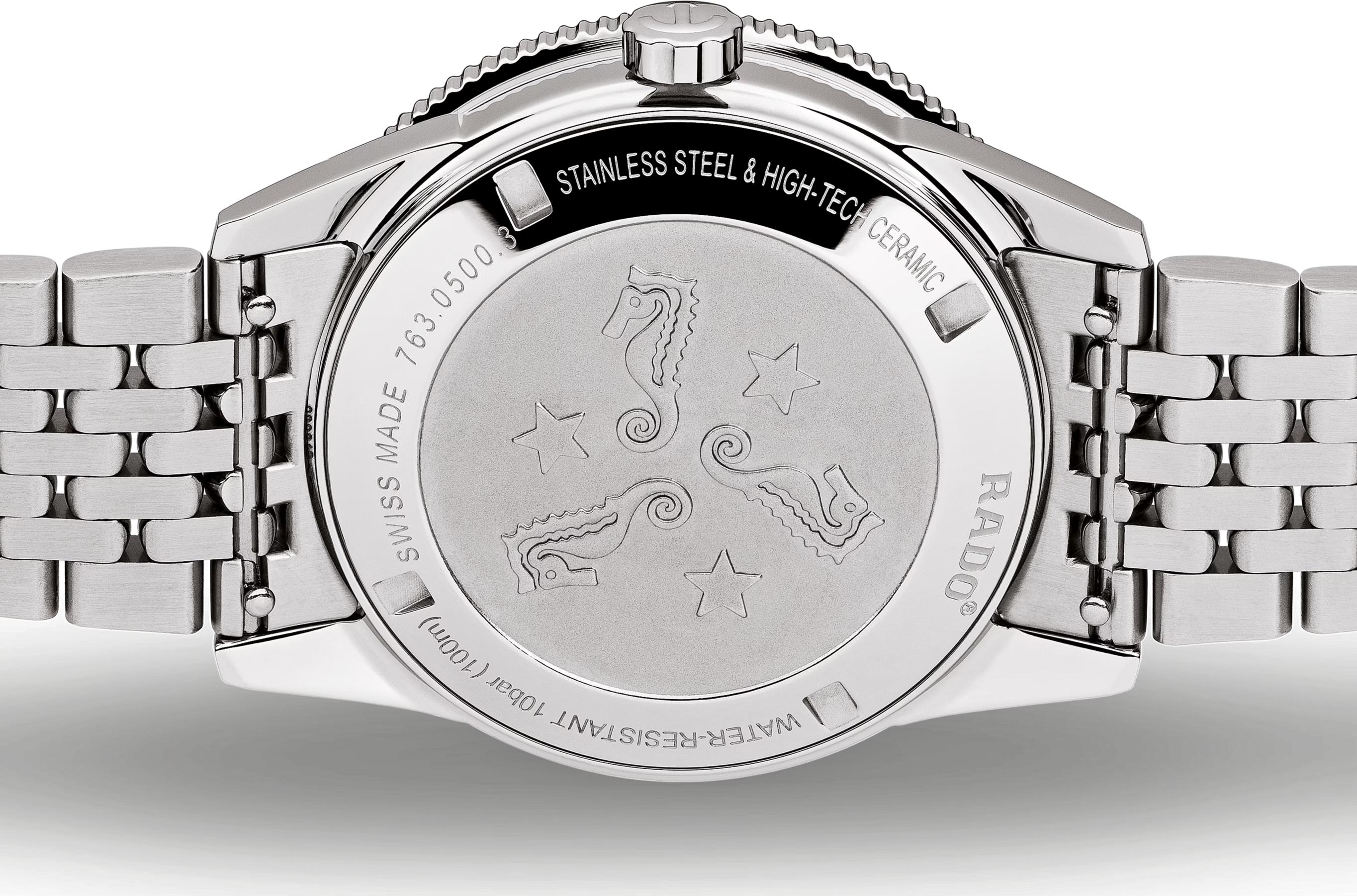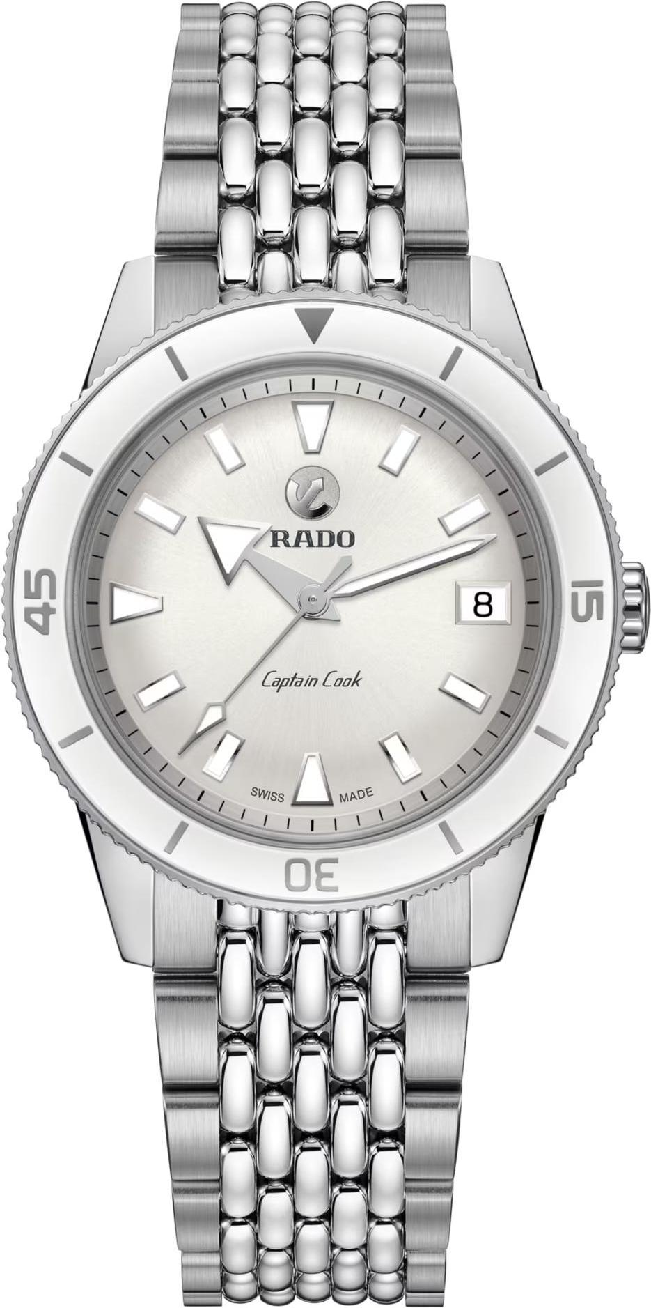 RADO Женские швейцарские часы Captain Cook R32500013. Механические с автоподзаводом. Пружина механизма заводится автоматически благодаря естественным движениям владельца в процессе ежедневной носки часов. На стрелки и отметки нанесен светонакопительный состав, благодаря этому считывать информацию с циферблата возможно и в темноте. Браслет из нержавеющей стали обладает высокой прочностью и износостойкостью, обеспечивая долговечность даже при активной эксплуатации. Материал устойчив к коррозии и сохраняет свой внешний вид надолго. Корпус изготовлен из высококачественной нержавеющей стали 316L с высокими антикоррозийными свойствами. Керамический корпус. Материал абсолютно гипоаллергенный, обладает высокой износостойкостью и устойчивостью к царапинам. Сапфировое стекло. Искусственно изготовленное стекло с высокой прочностью и устойчивостью к царапинам. Часы являются водонепроницаемыми до 10 Бар. Цвет корпуса: Серебристый. Цвет циферблата: Белый. Толщина: 11 мм. Гарантия: 2 года.