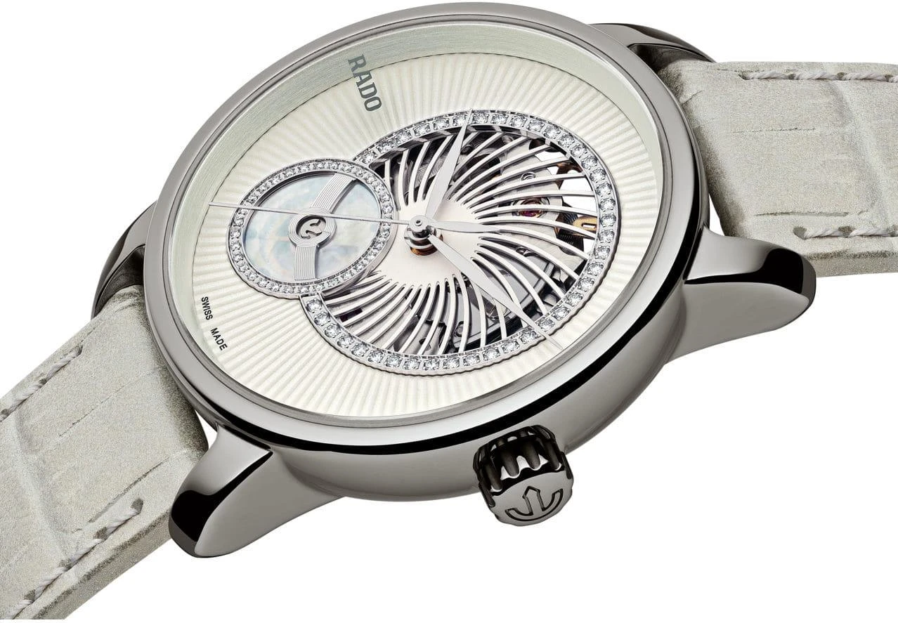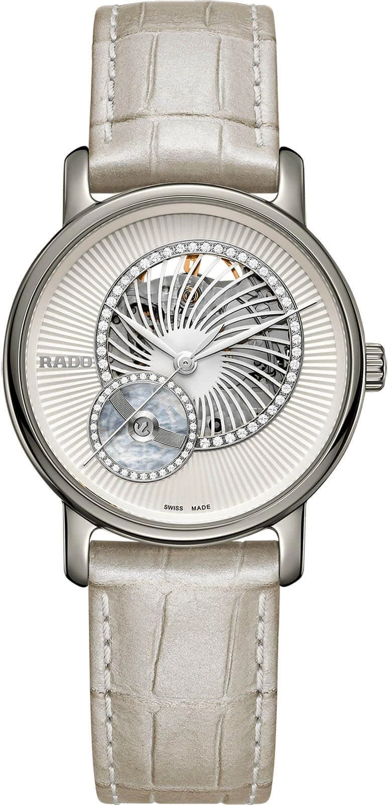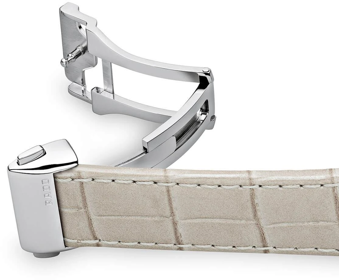 RADO Женские швейцарские часы Diamaster R14056935. Механические с автоподзаводом. Пружина механизма заводится автоматически благодаря естественным движениям владельца в процессе ежедневной носки часов. Ремешок изготовлен из кожи. Гибкость такого ремешка позволяет точно регулировать посадку часов на руке. Керамический корпус. Материал абсолютно гипоаллергенный, обладает высокой износостойкостью и устойчивостью к царапинам. Сапфировое стекло. Искусственно изготовленное стекло с высокой прочностью и устойчивостью к царапинам. Часы являются водонепроницаемыми до 5 Бар. Цвет корпуса: Серебристый. Цвет циферблата: Бежевый. Толщина: 10 мм. Гарантия: 2 года.