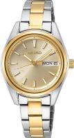 Женские наручные часы Seiko CS Dress SUR354P1. Точный кварцевый механизм с аналоговой индикацией. Корпус изготовлен из высококачественной нержавеющей стали 316L с высокими антикоррозийными свойствами. На стрелки и отметки нанесен светонакопительный состав, благодаря этому считывать информацию с циферблата возможно и в темноте. На циферблате отображается текущее число месяца и день недели. Браслет из нержавеющей стали. Сапфировое стекло. Искусственно изготовленное стекло с высокой прочностью и устойчивостью к царапинам. Часы являются водонепроницаемыми до 10 Бар. Цвет корпуса: Серебристый. Цвет циферблата: Золотистый. Гарантия: 2 года.
