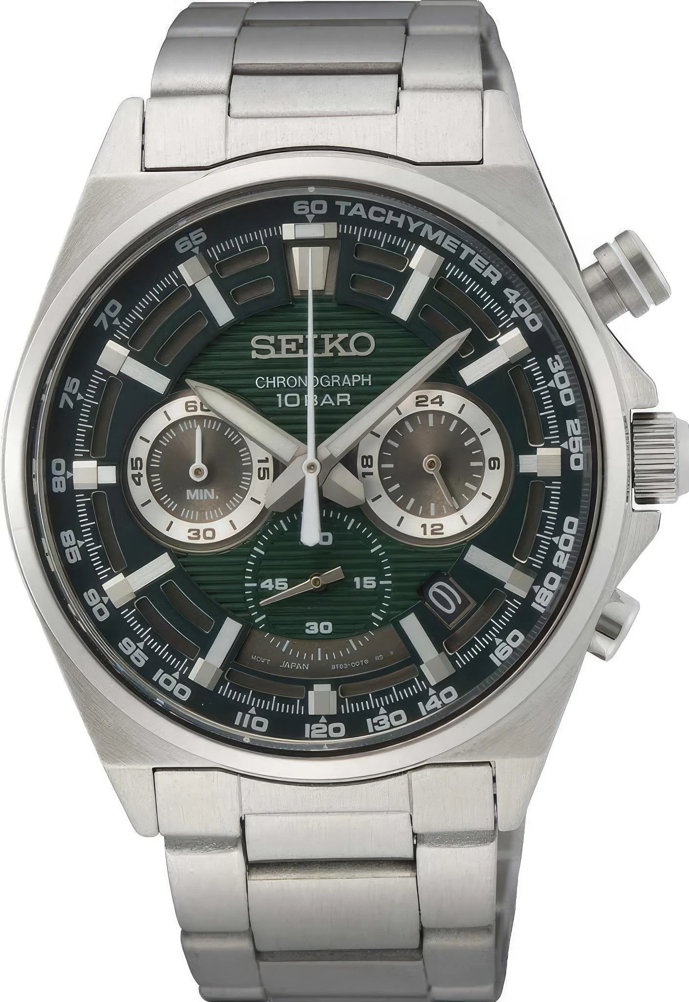 Мужские наручные часы Seiko CS Sports SSB405P1. Точный кварцевый механизм с аналоговой индикацией. Корпус изготовлен из высококачественной нержавеющей стали 316L с высокими антикоррозийными свойствами. На стрелки и отметки нанесен светонакопительный состав, благодаря этому считывать информацию с циферблата возможно и в темноте. На циферблате отображается текущее число месяца. Функция хронографа. Отображение времени возможно в 12-часовом или 24-часовом формате. Браслет из нержавеющей стали. Прочное, устойчивое к царапинам минеральное стекло защищает часы от повреждений. Часы являются водонепроницаемыми до 10 Бар. Цвет корпуса: Серебристый. Цвет циферблата: Зеленый. Ширина (с заводной головкой): 41мм. Толщина: 12мм. Гарантия: 2 года.