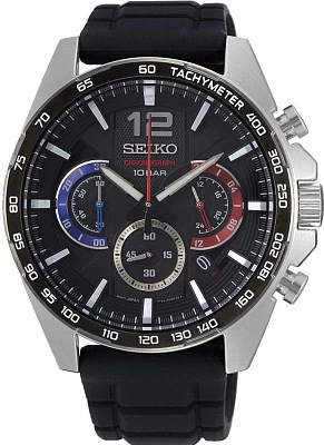 Мужские наручные часы Seiko Discover More SSB347P1. Точный кварцевый механизм с аналоговой индикацией. Полимерный ремешок. Натуральный полимерный материал является идеальным для изготовления ремешка благодаря своей чрезвычайной прочности и гибкости. Функция хронографа. Отображение времени возможно в 12-часовом или 24-часовом формате. Браслет из нержавеющей стали. Прочное, устойчивое к царапинам минеральное стекло защищает часы от повреждений. На циферблате отображается текущее число месяца. Часы являются водонепроницаемыми до 10 Бар. Цвет циферблата: Серебристый. Цвет циферблата: Черный. Цвет корпуса: Черный. На стрелки и отметки нанесен светонакопительный состав, благодаря этому считывать информацию с циферблата возможно и в темноте. Толщина: 13 мм. Гарантия: 2 года.