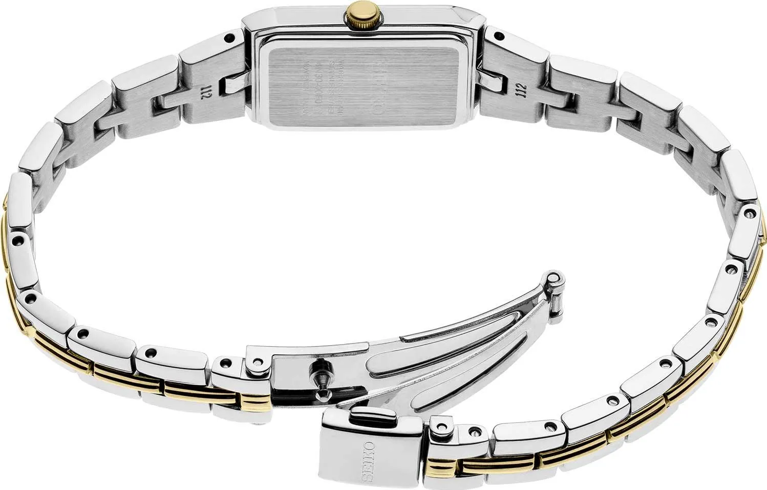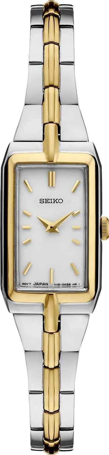Женские кварцевые часы с белым циферблатом и центральными часовой и минутной стрелками воплощают элегантность и утонченность. Прямоугольный корпус из нержавеющей стали с частичным PVD-покрытием под желтое золото имеет изящные размеры: ширину 15,5 мм и толщину 5,6 мм. Модель дополнена стальным браслетом с частичным покрытием и раскладывающейся застежкой, обеспечивающей удобство ношения. Циферблат защищен минеральным стеклом Hardlex, устойчивым к повреждениям, а уровень водонепроницаемости WR 30 гарантирует защиту от брызг. Эти часы станут идеальным аксессуаром для тех, кто ценит сдержанный стиль и надежность.