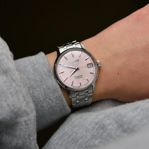 Женские механические часы с автоподзаводом из серии Presage. Круглый корпус из нержавеющей стали. Розовый текстурированный циферблат. Минеральное стекло Hardlex. Прозрачная задняя крышка. Водозащита 50 м. Стальной браслет. Раскладывающаяся застежка.