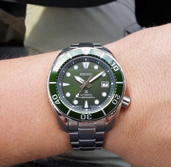 Мужские механические часы с автоподзаводом с возможностью ручного завода из серии Prospex. Круглый стальной корпус. Зеленый циферблат. Завинчивающаяся заводная головка. Сапфировое стекло. Браслет из нержавеющей стали. Водозащита 200м.