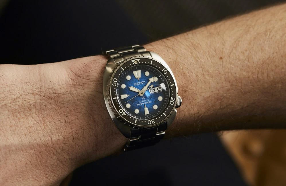 Seiko Prospex "King Turtle", специальная серия Save the Ocean, вдохновлена скатом Манта. Мотив, относящийся к этому охраняемому морскому виду, виден на синем циферблате. Это профессиональные водолазные часы с водонепроницаемостью до 200 метров