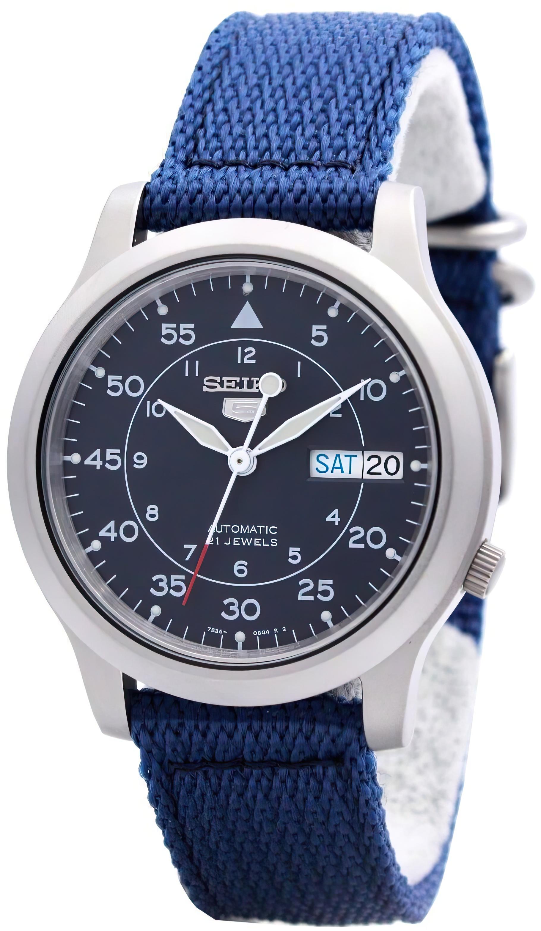 Мужские наручные часы Seiko Seiko 5 SNK807K2. Механические с ручным подзаводом. Корпус изготовлен из высококачественной нержавеющей стали 316L с высокими антикоррозийными свойствами. На стрелки и отметки нанесен светонакопительный состав, благодаря этому считывать информацию с циферблата возможно и в темноте. На циферблате отображается текущее число месяца и день недели. Текстильный ремешок. Прочное, устойчивое к царапинам минеральное стекло защищает часы от повреждений. Часы являются водонепроницаемыми до 3 Бар. Цвет корпуса: Серебристый. Цвет циферблата: Синий. Ширина (с заводной головкой): 37мм. Толщина: 11мм. Гарантия: 2 года.