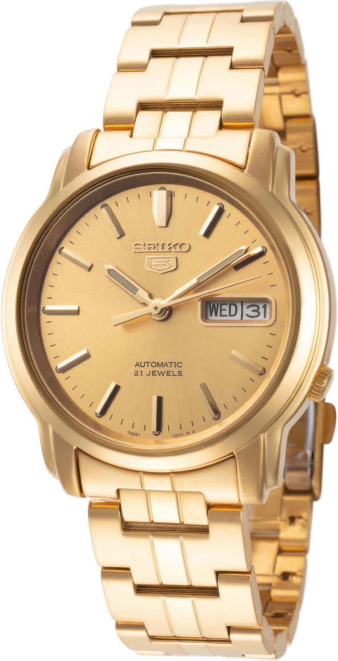 Мужские наручные часы Seiko Seiko 5 SNKK76K1. Механические с ручным подзаводом. Браслет из нержавеющей стали. Браслет из нержавеющей стали. Прочное, устойчивое к царапинам минеральное стекло защищает часы от повреждений. На циферблате отображается текущее число месяца и день недели. Часы являются водонепроницаемыми до 3 Бар. Цвет циферблата: Желтое золото. Цвет корпуса: Золотистый. На стрелки и отметки нанесен светонакопительный состав, благодаря этому считывать информацию с циферблата возможно и в темноте. Толщина: 11 мм. Гарантия: 2 года.