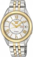 Мужские наручные часы Seiko Seiko 5 SNKL36J1. Механические с ручным подзаводом. Корпус изготовлен из высококачественной нержавеющей стали 316L с высокими антикоррозийными свойствами. На стрелки и отметки нанесен светонакопительный состав, благодаря этому считывать информацию с циферблата возможно и в темноте. На циферблате отображается текущее число месяца и день недели. Браслет из нержавеющей стали. Прочное, устойчивое к царапинам минеральное стекло защищает часы от повреждений. Часы являются водонепроницаемыми до 3 Бар. Цвет корпуса: Серебристый, желтое золото. Цвет циферблата: Белый. Ширина (с заводной головкой): 38мм. Толщина: 11мм. Гарантия: 2 года.
