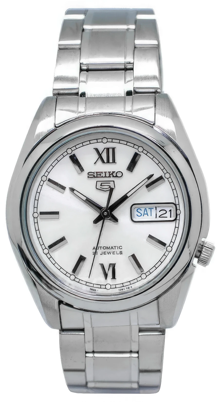 Мужские наручные часы Seiko Seiko 5 SNKL51K1. Механические с ручным подзаводом. Браслет из нержавеющей стали. Браслет из нержавеющей стали. Прочное, устойчивое к царапинам минеральное стекло защищает часы от повреждений. На циферблате отображается текущее число месяца и день недели. Часы являются водонепроницаемыми до 3 Бар. Цвет циферблата: Серебристый. Цвет корпуса: Белый. На стрелки и отметки нанесен светонакопительный состав, благодаря этому считывать информацию с циферблата возможно и в темноте. Толщина: 11 мм. Гарантия: 2 года.