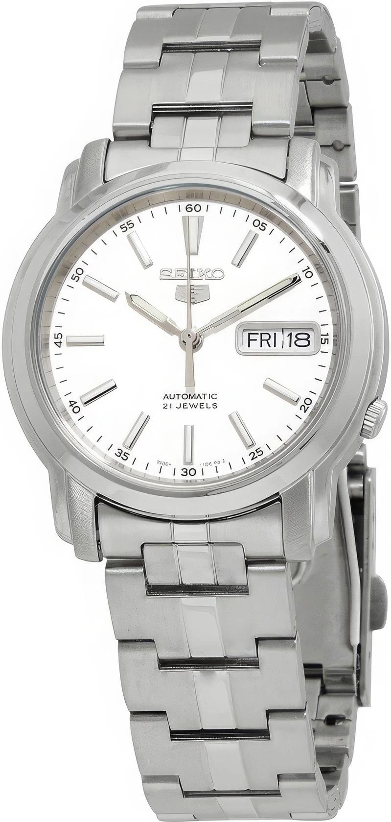 Мужские наручные часы Seiko Seiko 5 SNKL75K1. Механические с автоподзаводом. Пружина механизма заводится автоматически благодаря естественным движениям владельца в процессе ежедневной носки часов. Браслет из нержавеющей стали. Браслет из нержавеющей стали. Прочное, устойчивое к царапинам минеральное стекло защищает часы от повреждений. На циферблате отображается текущее число месяца и день недели. Часы являются водонепроницаемыми до 3 Бар. Цвет циферблата: Серебристый. Цвет корпуса: Белый. На стрелки и отметки нанесен светонакопительный состав, благодаря этому считывать информацию с циферблата возможно и в темноте. Толщина: 11 мм. Гарантия: 2 года.