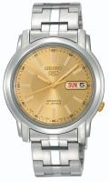 Мужские наручные часы Seiko Seiko 5 SNKL81K1. Механические с ручным подзаводом. Браслет из нержавеющей стали. Браслет из нержавеющей стали. Прочное, устойчивое к царапинам минеральное стекло защищает часы от повреждений. На циферблате отображается текущее число месяца и день недели. Часы являются водонепроницаемыми до 3 Бар. Цвет циферблата: Серебристый. Цвет корпуса: Золотистый. На стрелки и отметки нанесен светонакопительный состав, благодаря этому считывать информацию с циферблата возможно и в темноте. Толщина: 11 мм. Гарантия: 2 года.