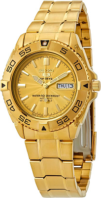 Мужские наручные часы Seiko Seiko 5 Sports SNZB26J1. Механические с ручным подзаводом. Браслет из нержавеющей стали. Браслет из нержавеющей стали. Прочное, устойчивое к царапинам минеральное стекло защищает часы от повреждений. На циферблате отображается текущее число месяца и день недели. Часы являются водонепроницаемыми до 10 Бар. Цвет циферблата: Желтое золото. Цвет корпуса: Золотистый. На стрелки и отметки нанесен светонакопительный состав, благодаря этому считывать информацию с циферблата возможно и в темноте. Толщина: 10 мм. Гарантия: 2 года.